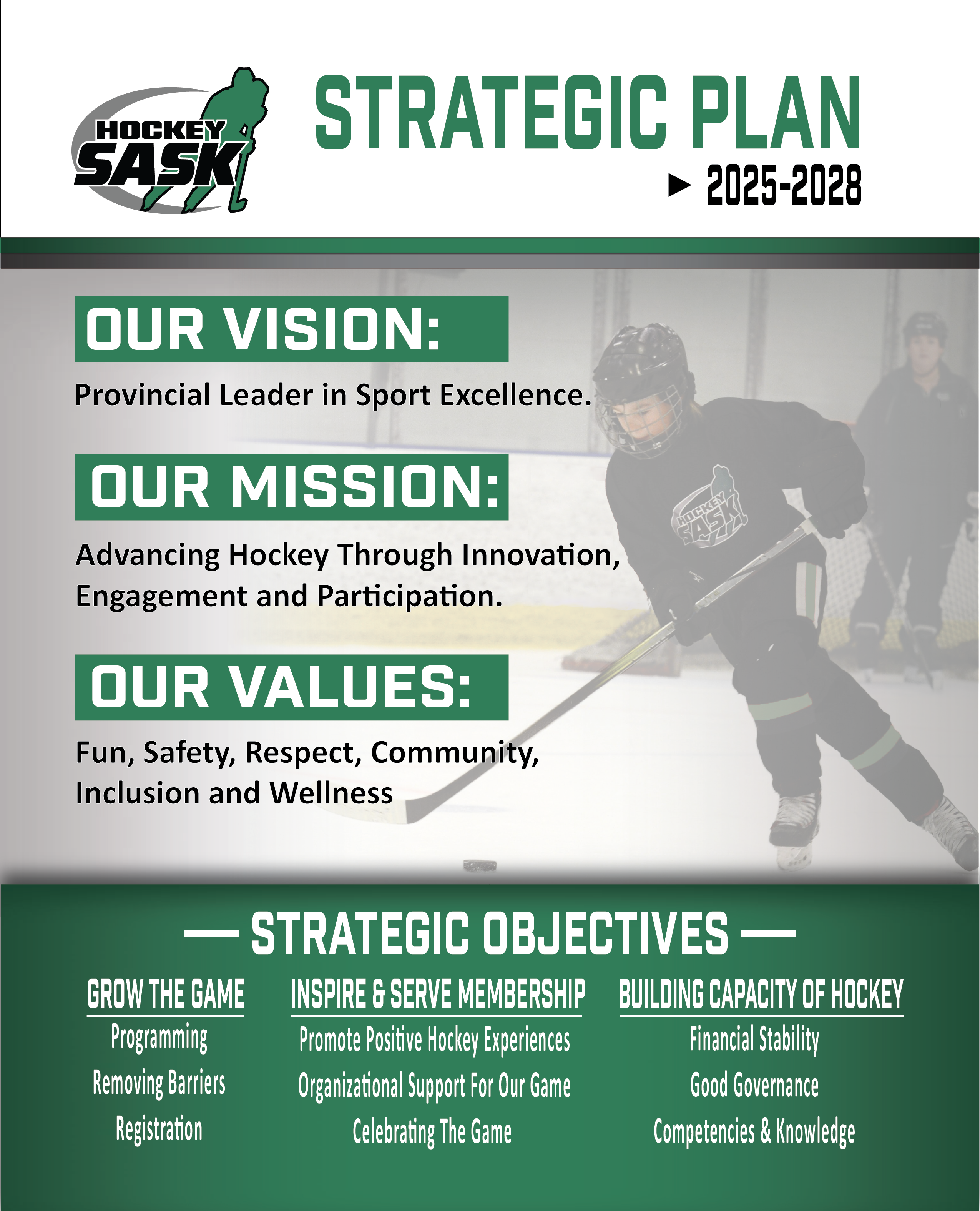 The Strategic Plan is built around three key objectives that will guide Hockey Saskatchewan’s efforts over the next three seasons: