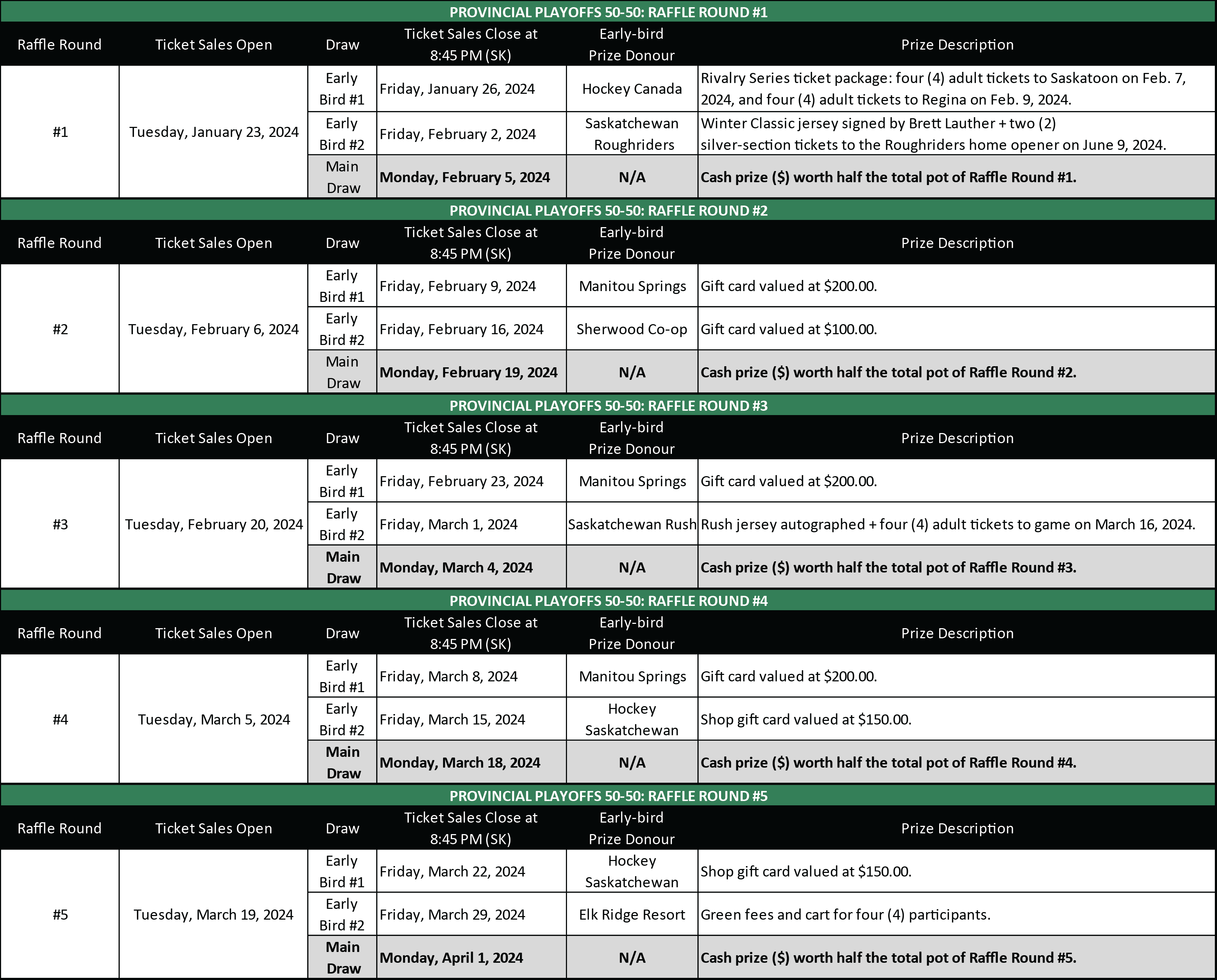 A total of fifteen (15) draws will be held over the raffle rounds with tickets first available starting at 9:00 AM (CST) on Jan. 23, 2024, and the final draw closing at 8:45 PM (SK) on April 1, 2024.