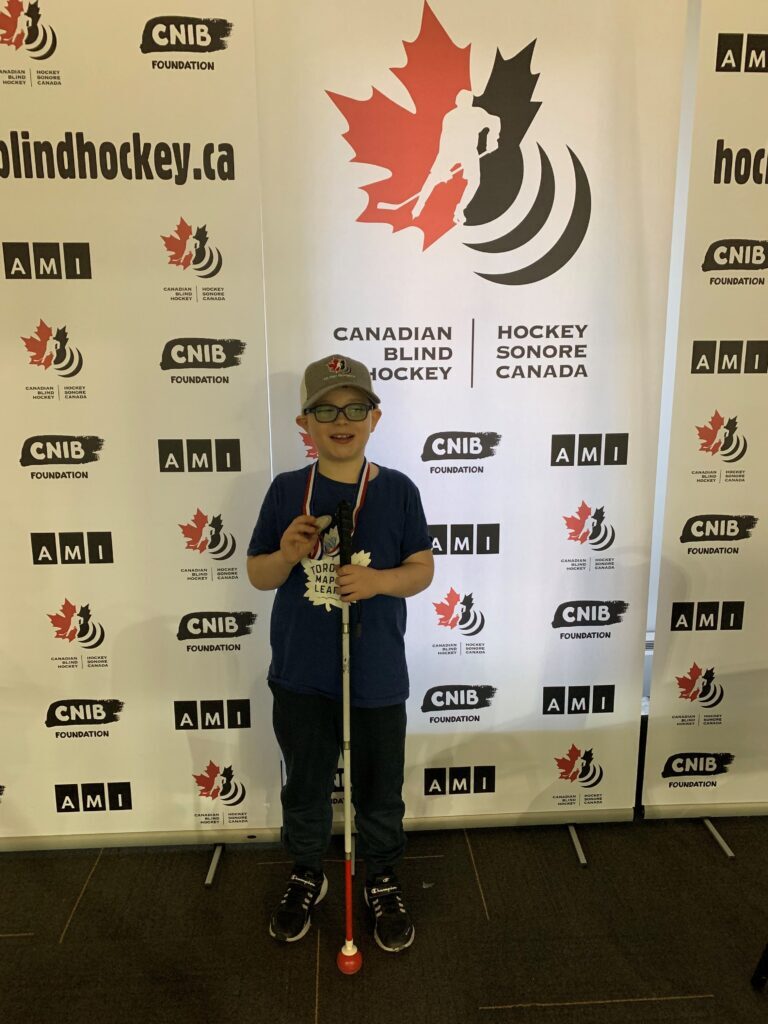 And that wasn’t always the case for the Gauthiers. Isaiah was born with Leber Congenital Amaurosis – or LCA – which means he has some light perception and he can see some shadowing but no colour. Isaiah relies on his braille skills for learning and his cane skills for mobility, so playing hockey wasn’t necessarily the first thing Renelle thought he would be interested in. But Isaiah was determined to play.