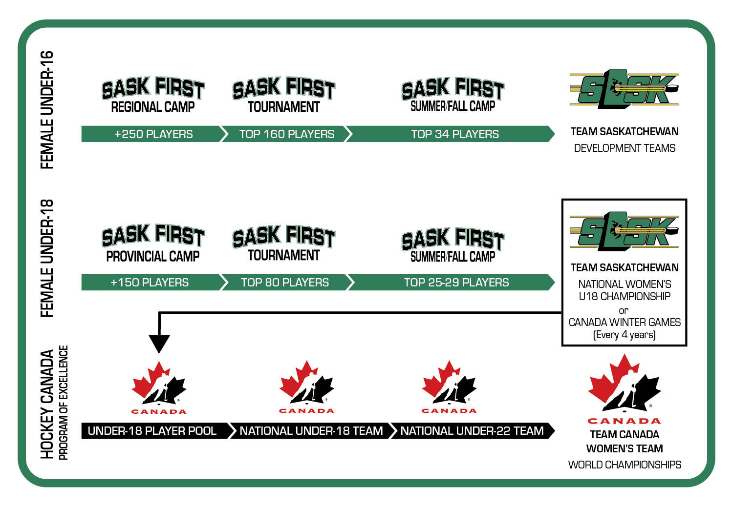 The Sask First Female Under-18 Program is a milestone of female hockey development in the province, beginning each season with regional camps held at two locations in the north and south of Saskatchewan. These camps are open to all players within the age division, providing a foundational platform for emerging talent. From these regional camps, the top players are selected to participate in the prestigious Sask First Tournament held in April. This tournament serves as a critical step in the selection process, with up to 30 players chosen to attend the subsequent summer and fall camps.