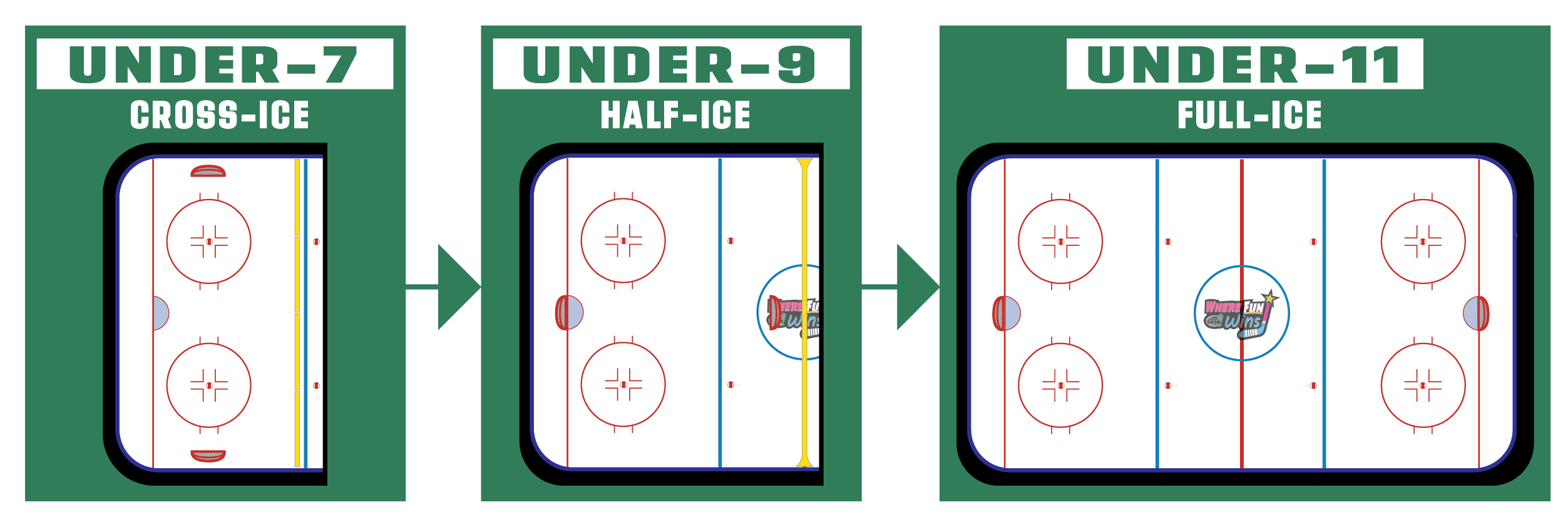 As young players develop their skills, the size of the playing surface evolves to match their growing abilities and needs. Starting with cross-ice games at the Under-7 (U7) level, players benefit from a smaller playing area that encourages more engagement, puck touches, and opportunities to practice skating and other fundamental skills.