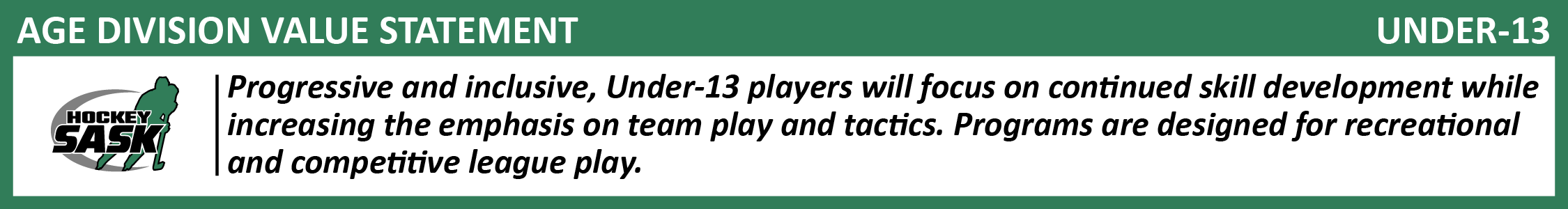 U13 is the first age division with Provincial Playoffs, the introduction of AA hockey, and pathways that lead to Sask First programs and eventually Team Saskatchewan.