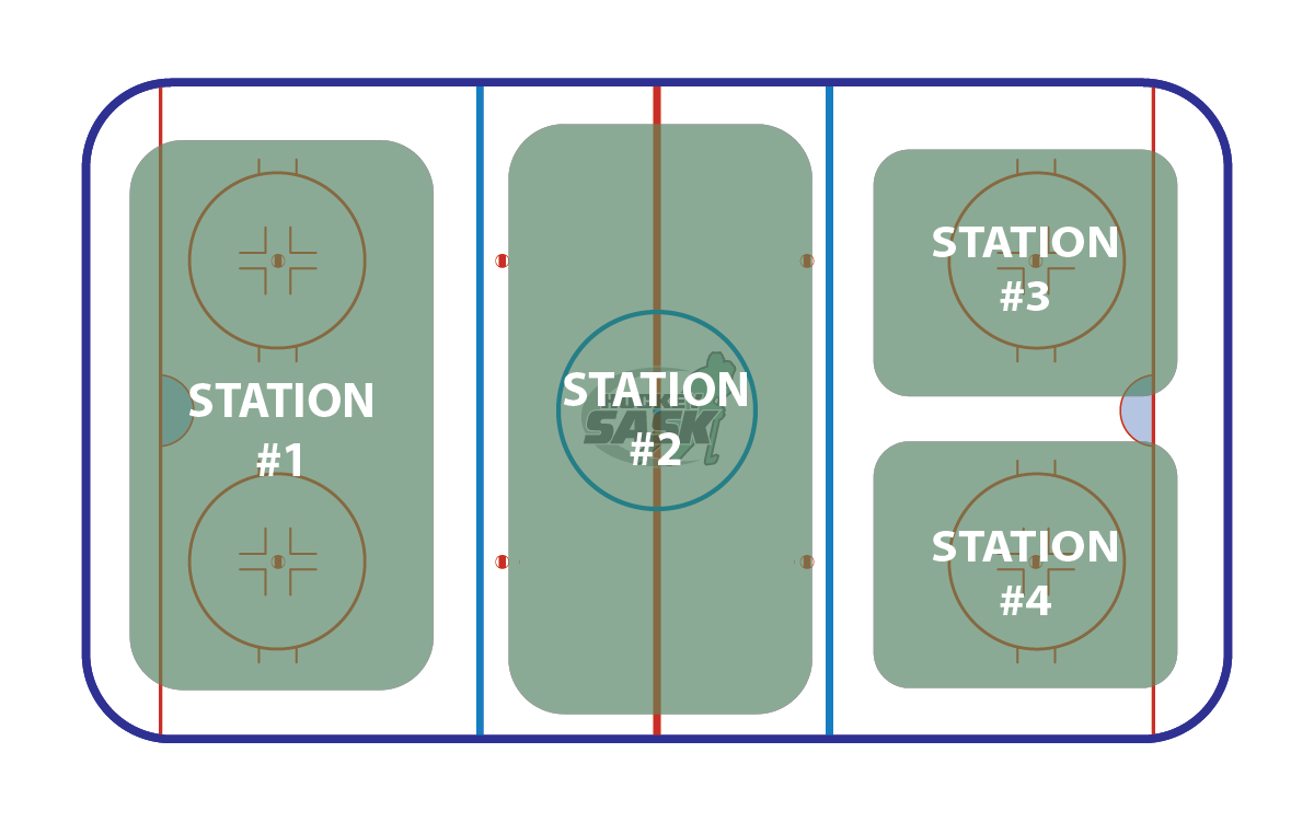 The following diagrams are suggestions for dividing the ice into suitable areas for skills instructions, depending on the number of groups you have.